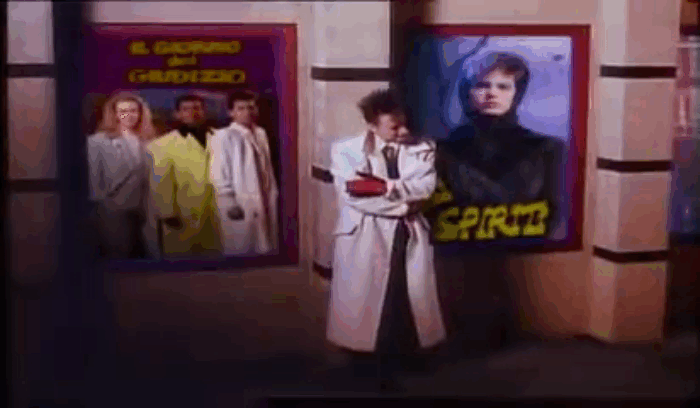 But back to the video. George spends a lot of time just wandering the streets of… Italy(?) He passes numerous movie posters featuring the members of Culture Club dancing and singing. It’s like the newspapers from Harry Potter.